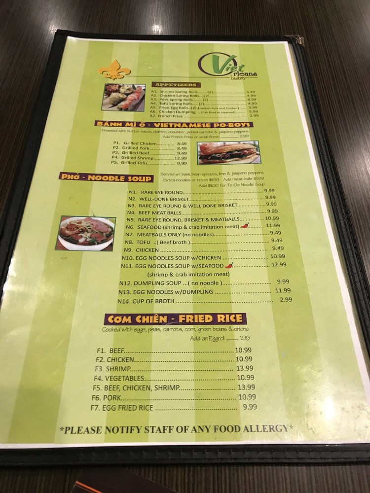 “ First day in the city that it decides to cool off for Fall and of course I wanted some soup. Pho is it! One of my favorite things to eat any day but even more on a cool day. lol I work in the downtown area so the walk to Viet Orleans was nice, I wouldn't say they have the best parking situation though. Its in the middle of everything. Walking in, everything is clean and ambiance is nice with TV's everywhere and a nice bar. I was greeted and instructed to sit anywhere I'd like. Moments later my server was happy to take my drink order of another fave of mine...the Thai Tea. There's was okay. Not bad but not the best I've ever had. With eyes bigger than my stomach I ordered the chicken pho and added meatballs, no onions, with a side of chili oil. AND a New Orleans Roll (overkill...lol). Everyone knows you have to taste your pho broth before adding anything to it. So, I did...and their broth is so rich and flavorful. You can tell they let their ancestors lead in the kitchen lmbo. But I still add chili oil for a little kick. The meatballs were really good and they thinly sliced chicken was good too. Needless to say, I finished my bowl and only ate one piece of my sushi which I thought was just okay, like the tea. I wasn't really checked on during my visit but the interactions I did have with the staff was still pleasant. I have a horrible habit of going places with no card, but thankfully they accept "tap" to pay. I'll be going back for the pho for sure. ”